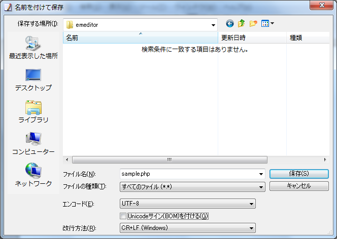 以下のように『エンコード(E)』は『UTF-8』に設定し、さらに『Unicodeサイン(BOM)を付ける(G)』にチェックは外しておきます。これで『保存(S)』ボタンを押すと、BOM無しの UTF-8 でファイルを保存することができます。(クリックすると拡大表示されます。)
