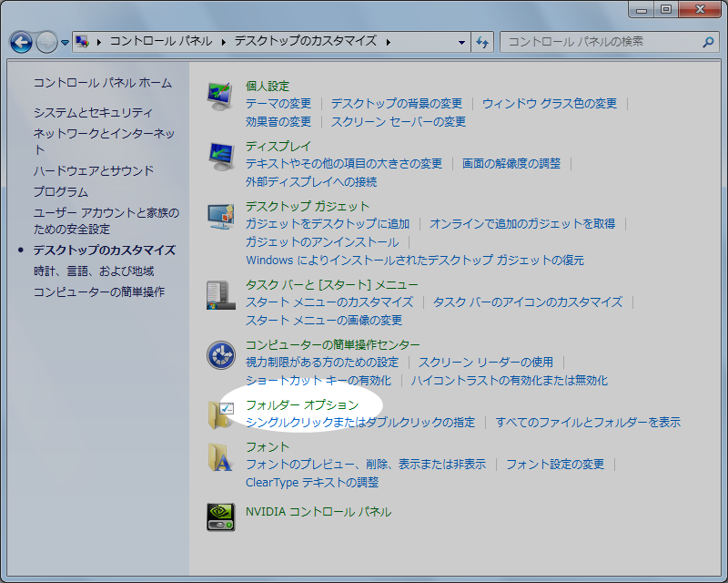 以下はWindows7とWindowsVistaで拡張子を表示させる方法です。Windowsのスタートメニューから『コントロールパネル』を選択すると以下の画面が開くので、ここから『デスクトップのカスタマイズ』を選択します。(クリックすると拡大表示されます。)